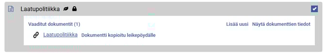 Dokumenttilinkin kopiointi käynnistyy linkin vieressä olevasta kuvakkeesta, josta klikkaamalla dokumenttilinkki kopioituu entiseen tapaan käyttöjärjestelmän yleiselle leikepöydälle esim. selaimen osoiteriville vietäväksi, ja nyt myös Complyn sisällä toiseen linkkikenttään liitettäväksi.