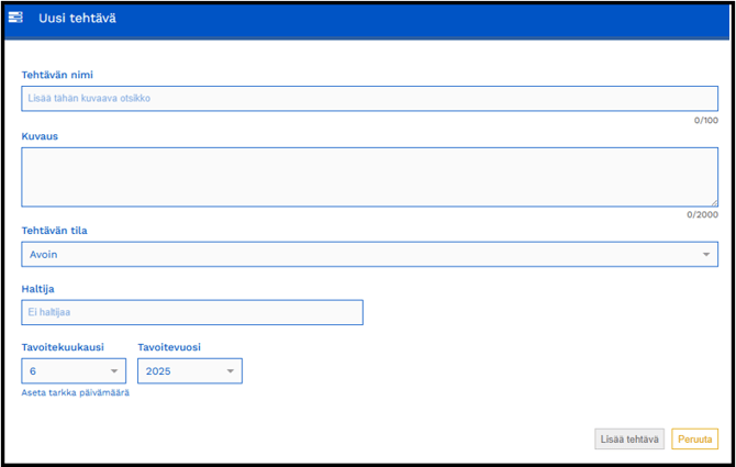 Tehtävälle annetaan nimi, kuvaus, vastuuhenkilö sekä aikataulu.
