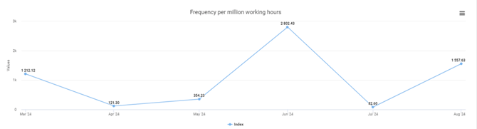 The next chart shows the observations from the selected template(s) per one million working hours, based on the working hours recorded in Impact. With the different filters, you can generate, for example, accident frequency rates for different departments or the ratios of other templates’ responses per million working hours.