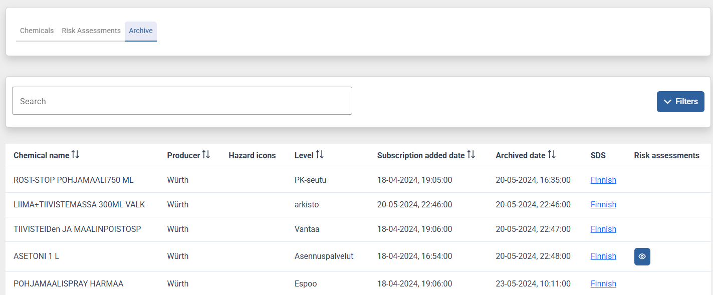 Archived chemicals can be viewed from a new Archive tab. There you can view the archived chemicals by location and have access to the chemical's safety data sheet, use range and previous risk assessments.