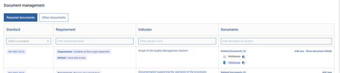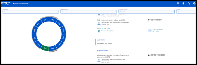 New feature is an overview of the documented information linked to Comply, which helps, among other things, to visualize the documentation required by each standard at a glance. The overview can be accessed from the new icon next to the annual planner icon.