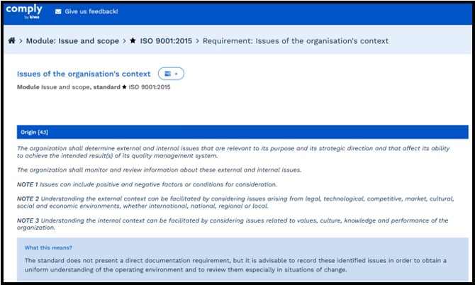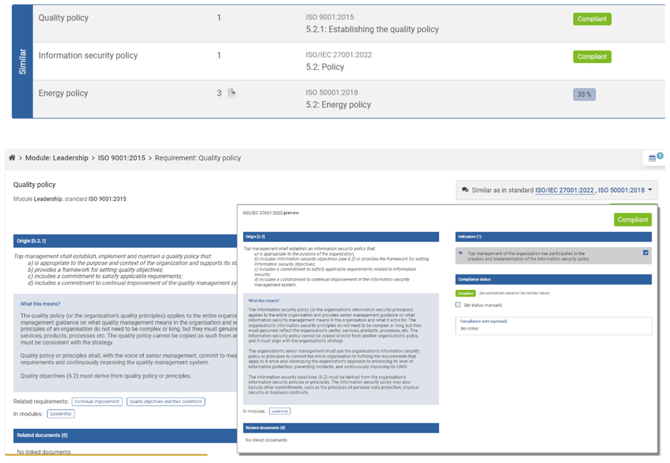 - further improved support of integrated management systems by identifying similar requirements and clearly grouping them in the module view. Similarity information covers all three supported standards ISO 9001, ISO 14001 and ISO/IEC 27001 crosswise.