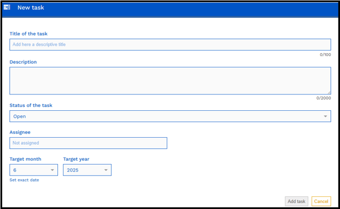 A new feature allows assigning tasks to users. Tasks can be set at the module, requirement, and indicator levels, and for ISO/IEC 27001, also at the individual control level.