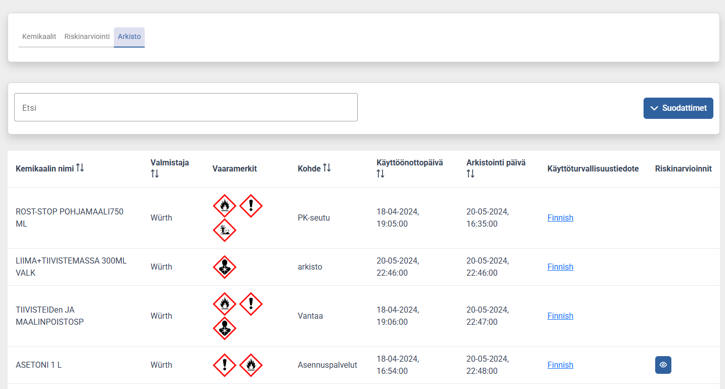 Kun kemikaali on arkistoitu kaikista kohteista, niin kemikaali poistuu kemikaalilistalta. Se kuitenkin säilyy erillisessä arkisto näkymässä.