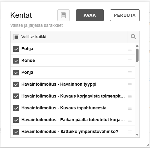 - Kentät painikkeen kautta voit valita mitä kenttiä haluat listalle.