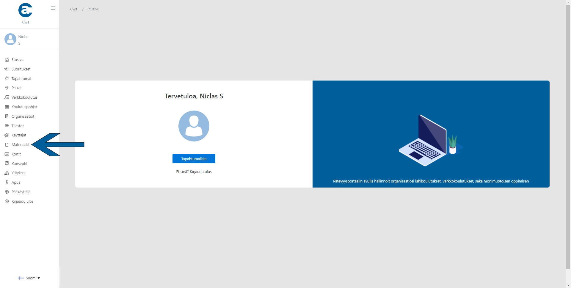 Sivustolle siirtyminen tapahtuu Competenceadmin.com sivuston kautta. Competenceadmin sivuston vasemmassa reunassa löytyy “Materiaalit” kohta. Tätä klikkaamalla aukeaa uudistettu materiaalisivusto, jota kautta pääset lataamaan materiaalit koneellesi.