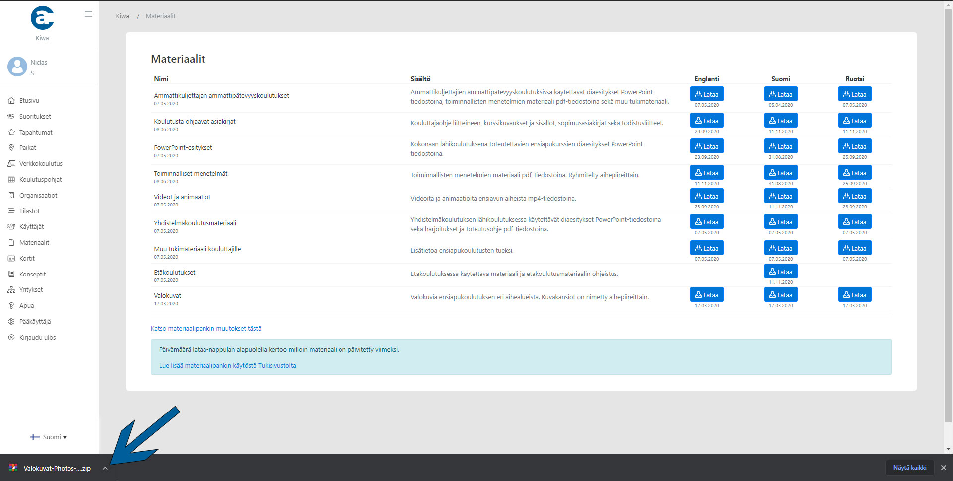 Sivustolla on jokaisesta materiaaliosiosta 3 eri kieliversiota, Tarkistahan että lataat oikean version opetusta varten. Ladattu tiedosto löytyy koneen asetuksista riippuen “ladatut tiedostot” kansiosta, ja google chromea käyttävällä tämä tiedosto näkyy myös suoraan selainikkunan vasemmassa alareunassa.