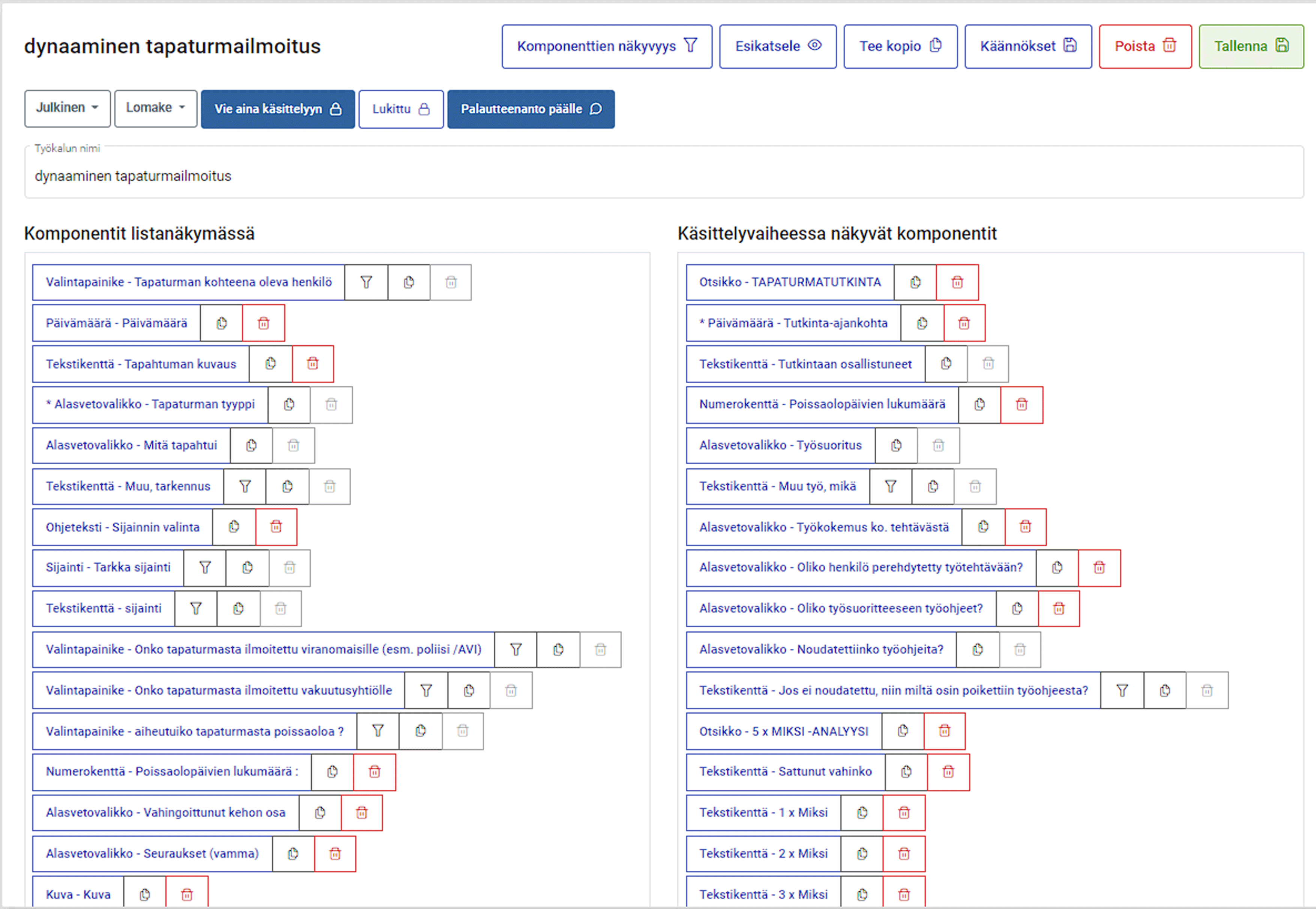 Dynaamisilla kentillä voidaan rakentaa työkaluihin ehtoja, joiden perusteella kentät näkyvät. Voit siis joko raportoijan tai käsittelijän tekemien kirjausten perusteella valita näytettävät lisätietokentät.