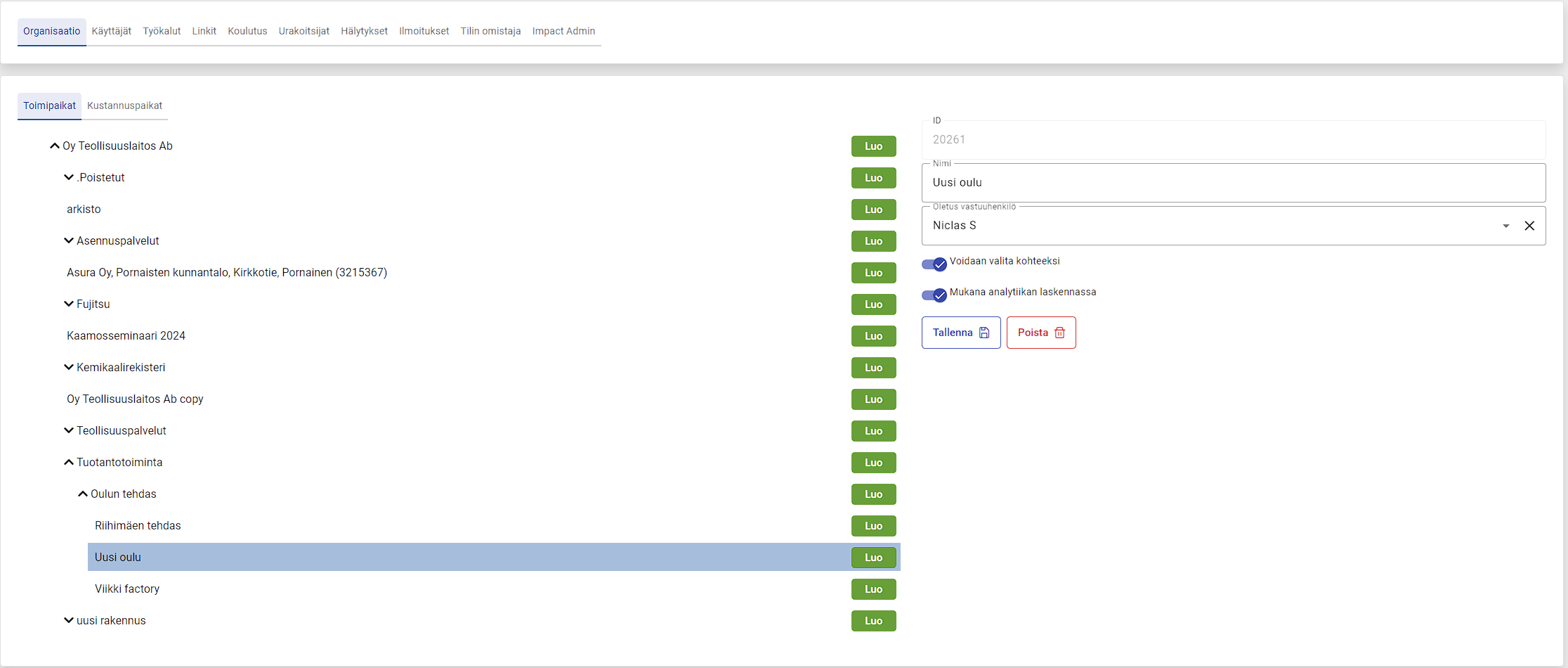 Huom!! kustannuspaikan muokkaaminen / rakentaminen vaatii Tilin omistaja -oikeudet. Pääkäyttäjillä ei ole mahdollisuutta niitä muokata / rakentaa.