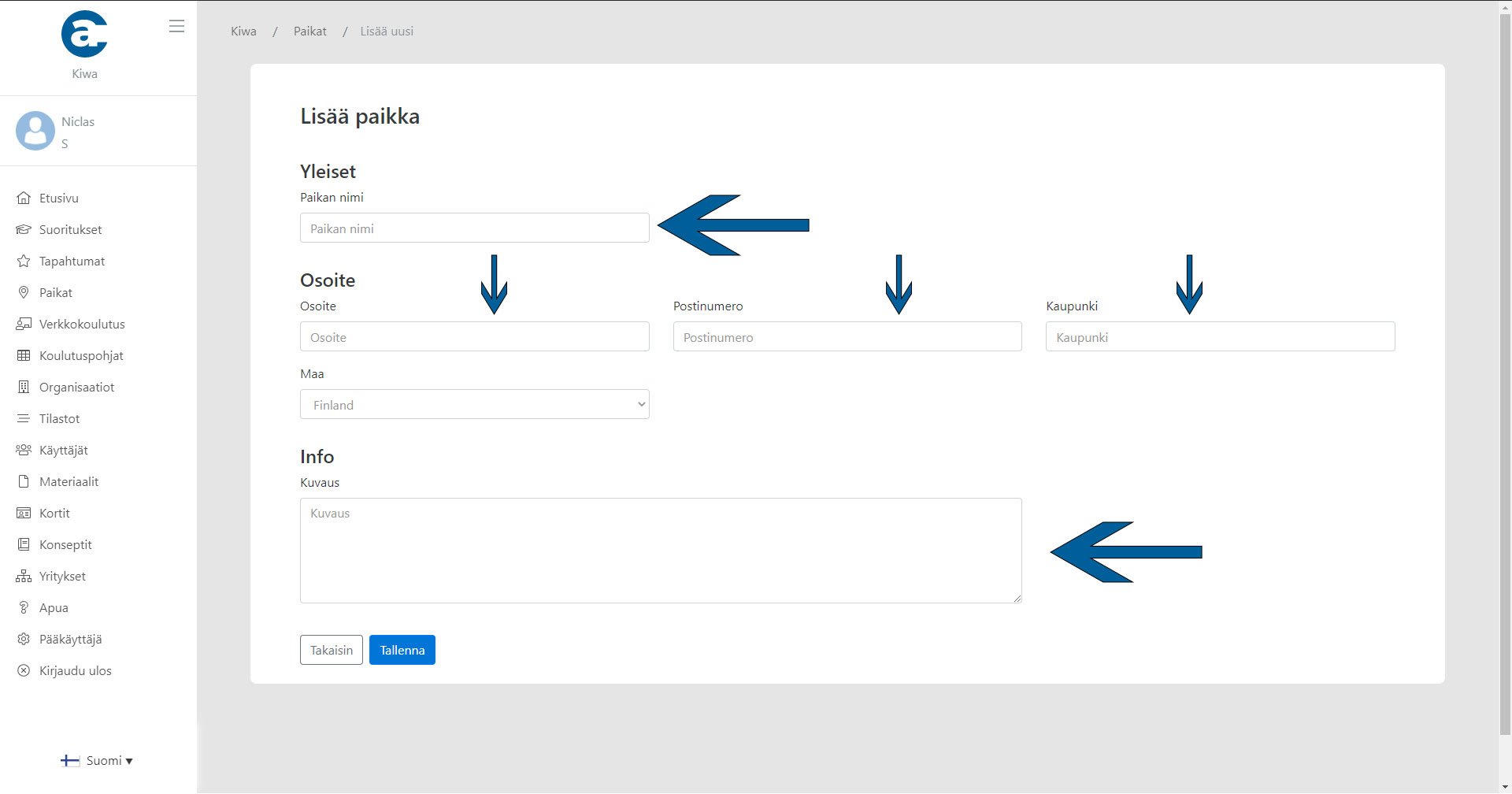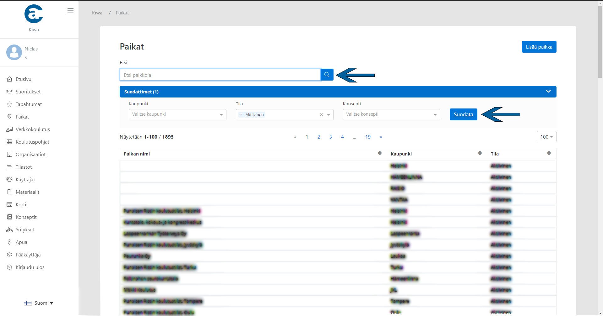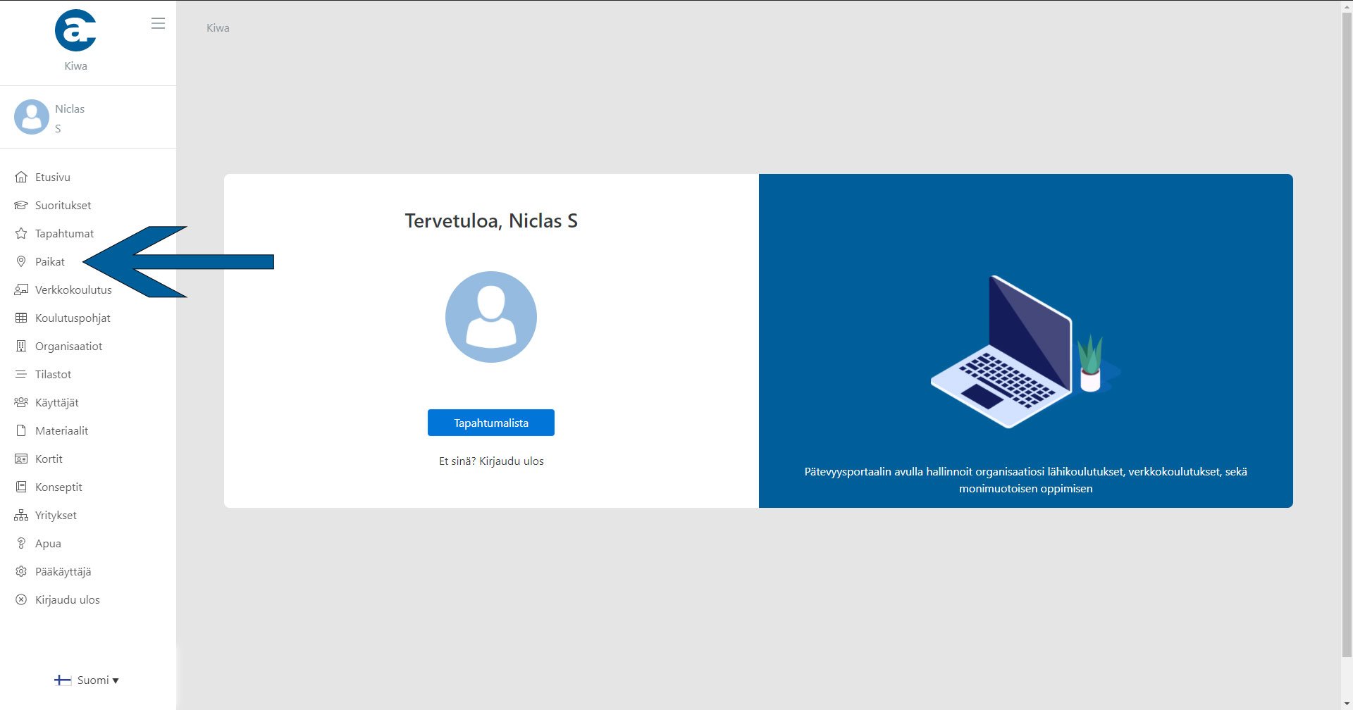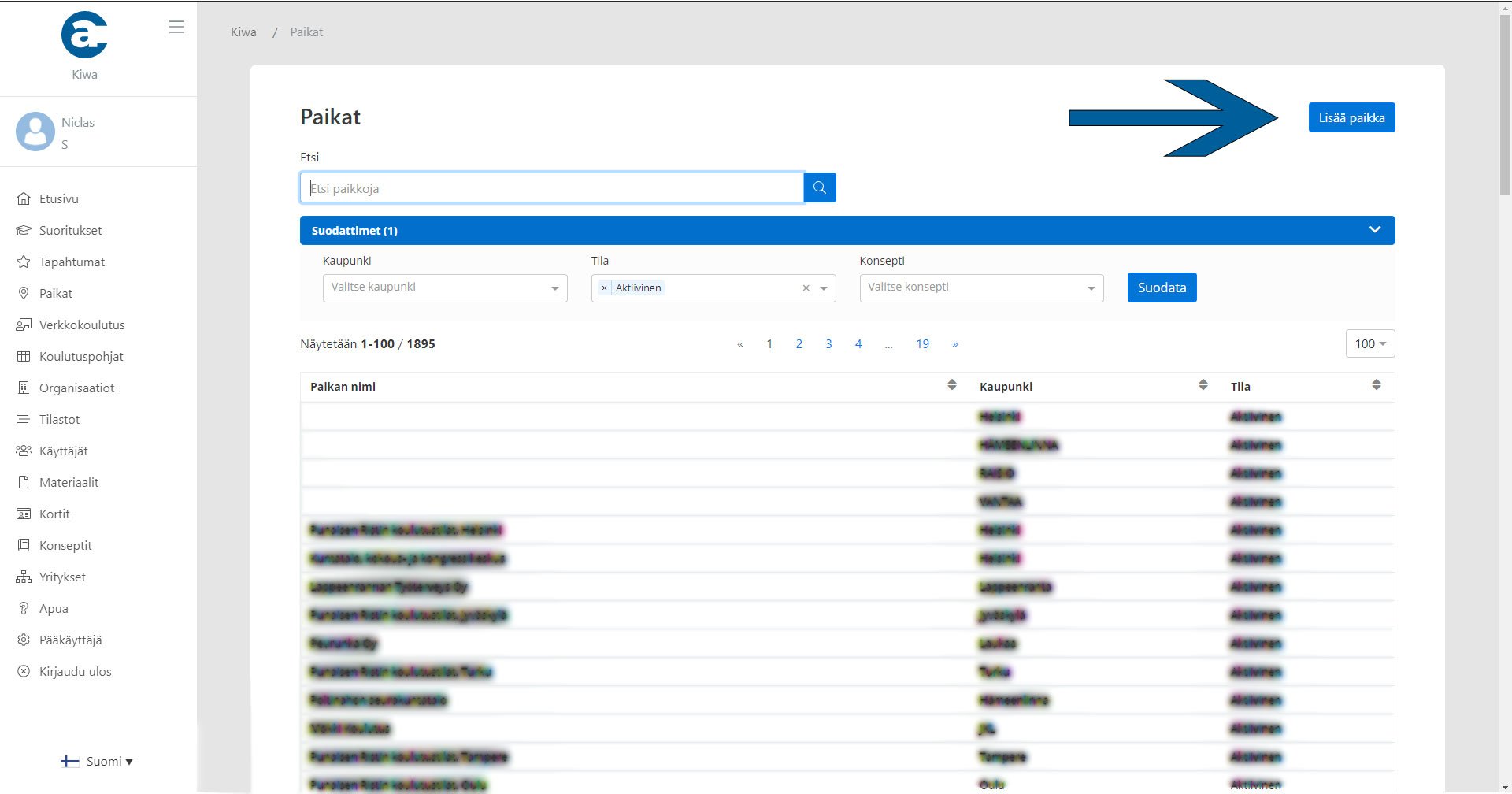 Voit hallinnoida "Paikat" välilehdeltä koulutuspaikkoja.