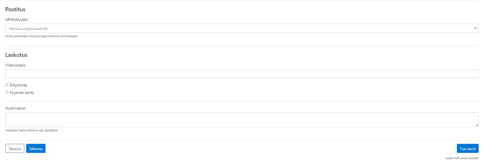 Mikäli koulutus on erityshintainen , tulee tämä valita jo koodien luomisen yhteydessä ruksimalla kohta "erityishintainen". Mikäli kurssista halutaan myös fyysinen kortti, valikoi myös "Fyysinen kortti" täppä. Huom! Mikäli koodeja luodaan useampi, ja vain osa on erityishintaisia / haluaa fyysisen kortin, tulee nämä koodit luoda erikseen. Esimerkiksi 10 koodia joista 4 haluaa kortin ja 6 eivät halua, tulee jompikumpi luoda erikseen.