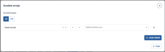JA/TAI arvolla voit valita pitääkö kaikkien ehtojen täyttyä, vai riittääkö vain jonkin ehdon täyttyminen.