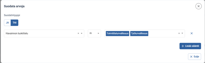 Käytössä valinta TAI= Tällöin vain yhden valituista säännöistä tulee olla täytetyssä työkalussa, jotta data tulee näkyviin.