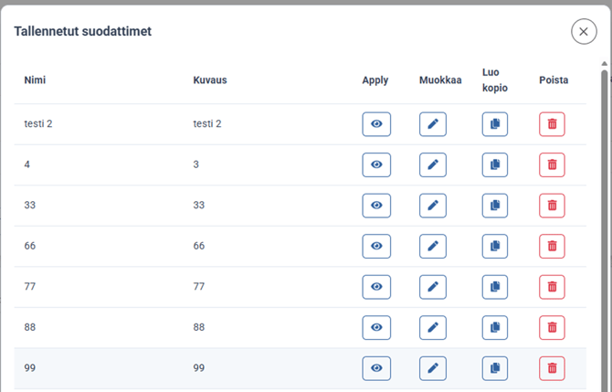 Saat tallentamasi suodattimet auki Tallennetut suodattimet-painikkeesta. Tallennettu suodattimet avautuvat uuteen ikkunaan. Tässä ikunnassa voit avata suodattimen silmä-ikonista, muokata sitä, luoda kopion tai poistaa sen.