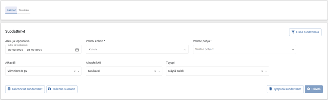 Suodattimen avulla voidaan määrittää tarkastelun aikaväli, jolle kuvaajat jakautuvat. Oletuksena suodattimessa on kuukausi samoin kuin myös Aikaväli-suodattimessa, yleensä tämä vaatii jommankumman suodattimen tai molempien päivitystä, jotta kuvaajaan saadaan data näkyviin.