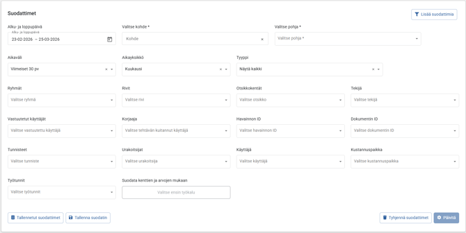 Suodattimella avulla voidaan valikoida kohde tai kohteet mihin tehtyjen havaintojen ja täytettyjen työkalujen data halutaan nähdä. Suodatin valinta vaaditaan aina ensimmäisenä ja valinnan jälkeen tulee muistaa paina päivitä.
